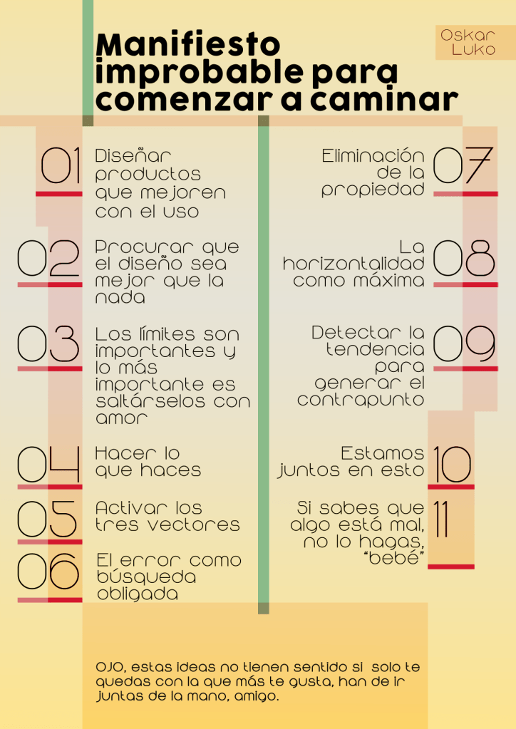 Con éste manifiesto mi intención es señalar unos puntos de atención que sirvan como consignas en el horizonte, unos conceptos que indiquen una dirección hacia la que apuntar la flecha de nuestras intenciones. El objetivo de este manifiesto es dibujar los márgenes de un río sobre el que se extiendan las aguas conceptuales del diseñador. La misión de este manifiesto es plasmar unos parámetros que sirvan de trampolín hacia un diseño integral. La función de este manifiesto es colocar las piedras que sirvan de apoyos para construir la escalera hacia algo por conocer. Este manifiesto no es una solución en sí, ni un manual de instrucciones, ni una guía para el éxito, sino que es la propia búsqueda.